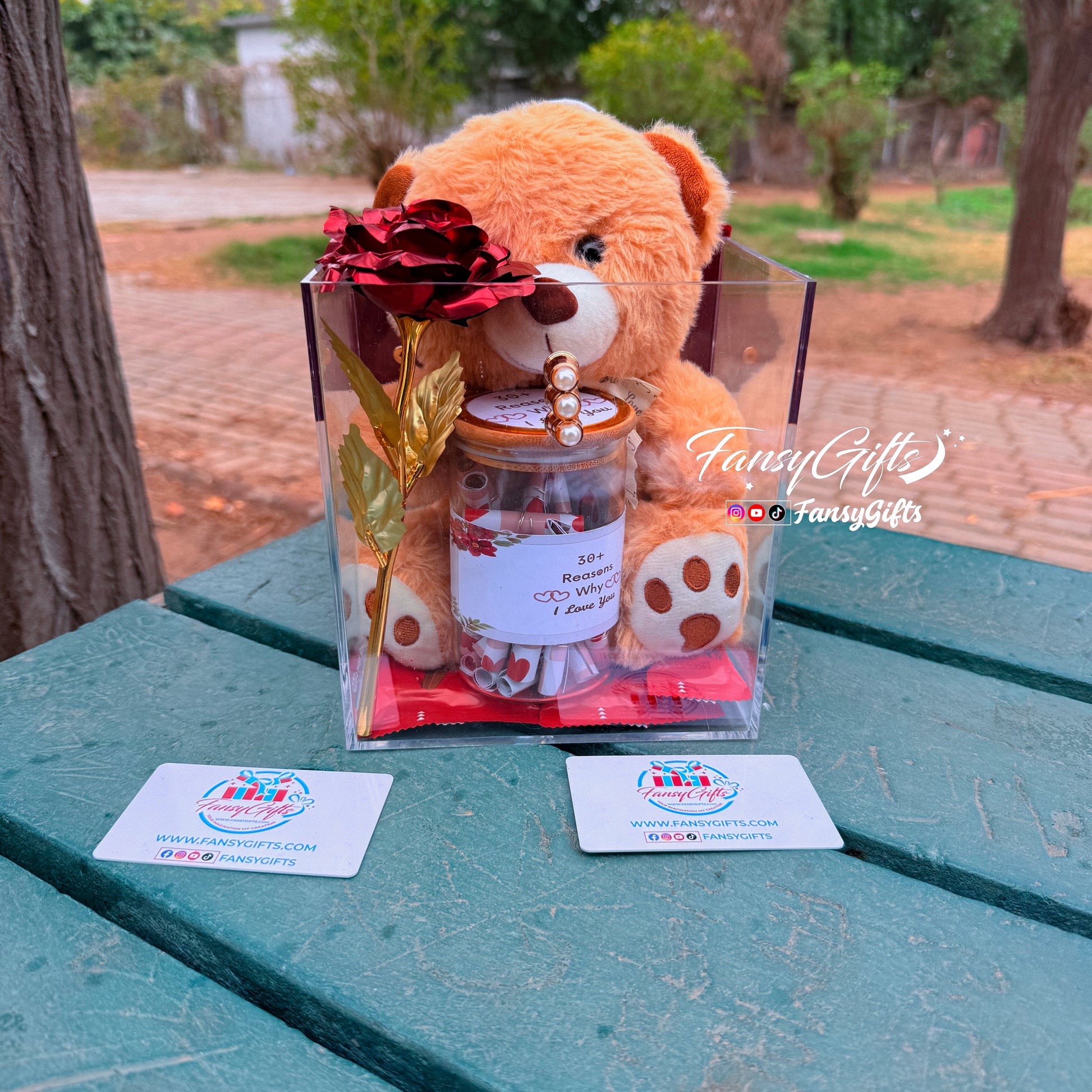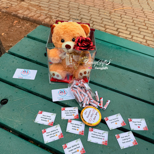 Luxury Transparent Carry Box - Teddy, Metal Flower, Chocolates & Jar