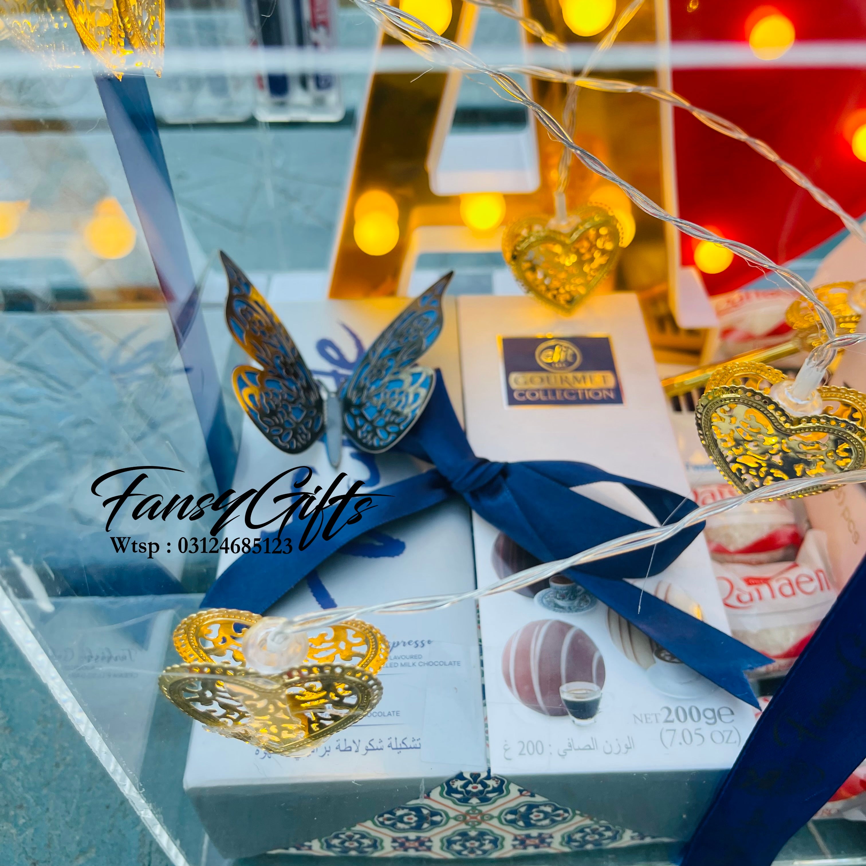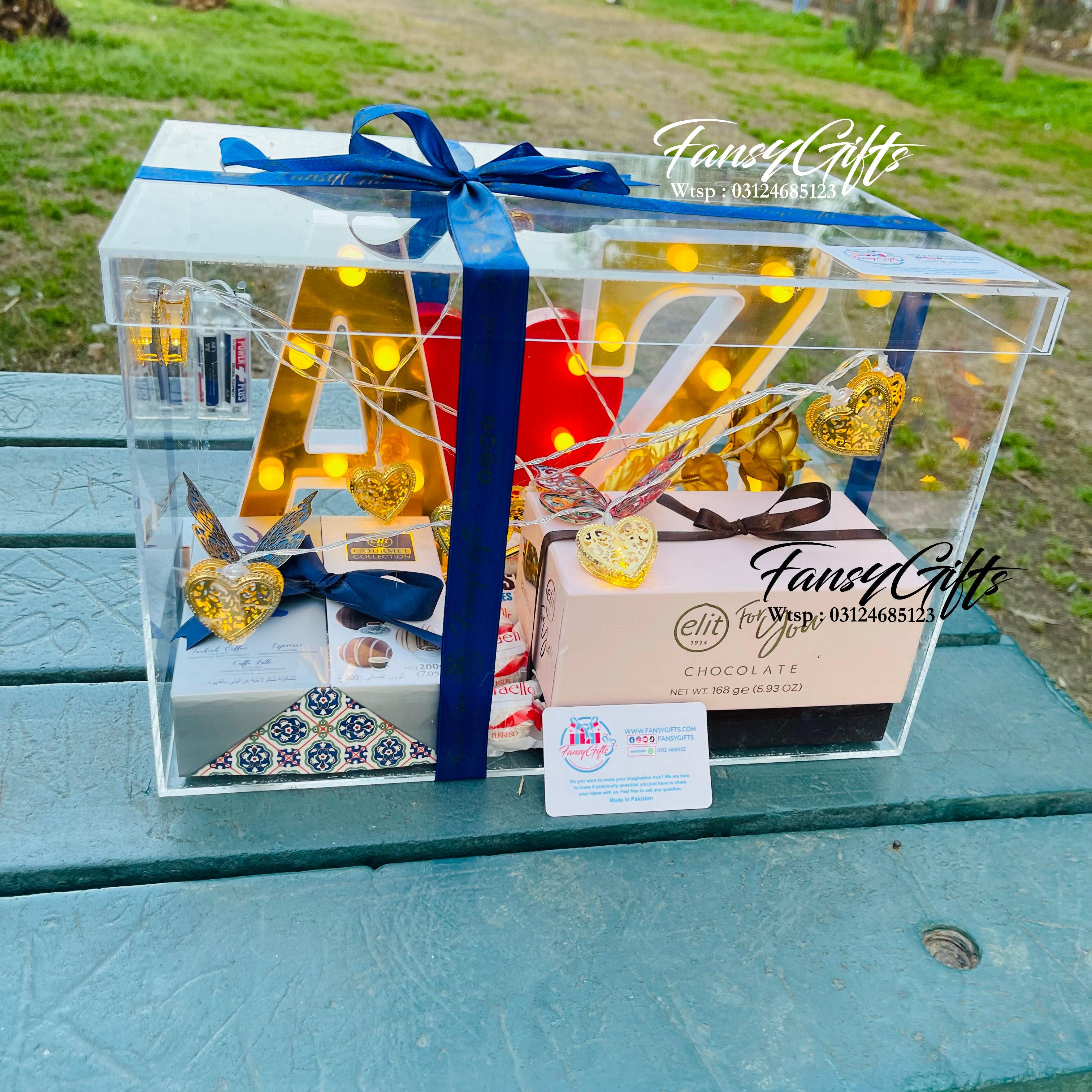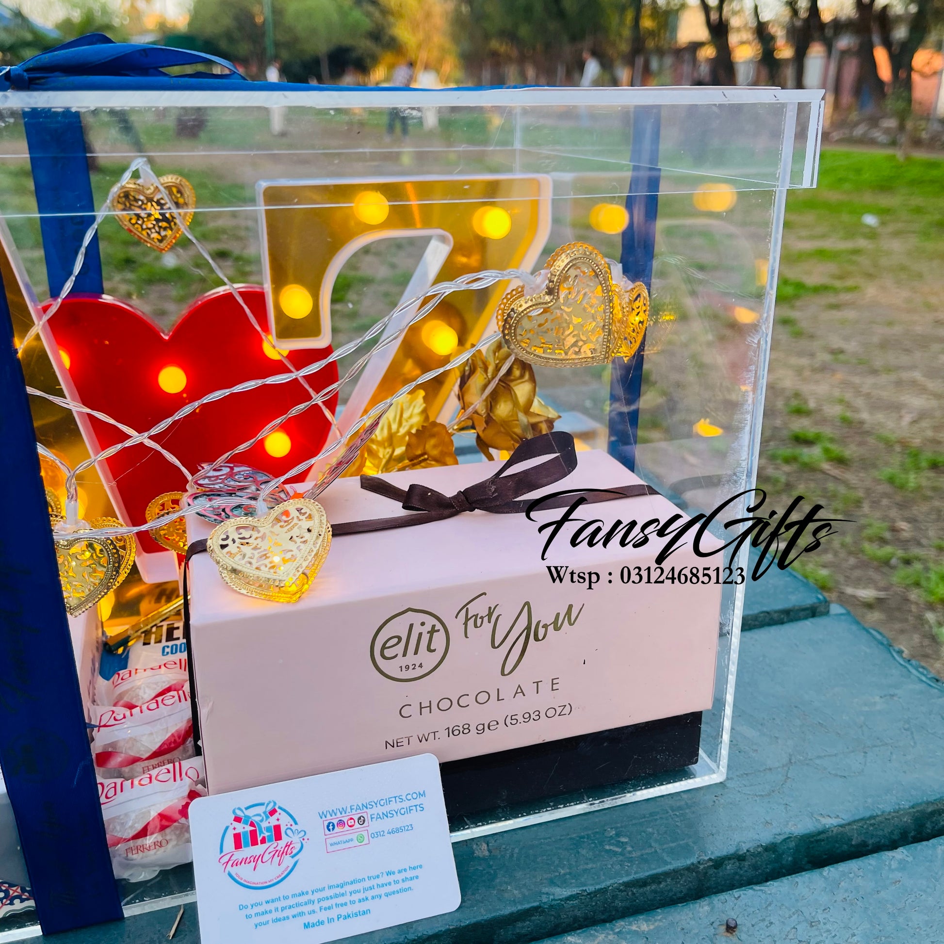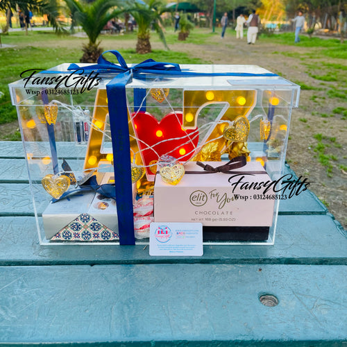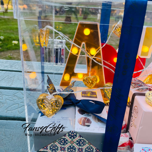 A stunning acrylic box featuring LED couple letters and heart design, beautifully decorated with lights and filled with premium chocolate boxes. The perfect surprise gift for your loved one on special occasions.