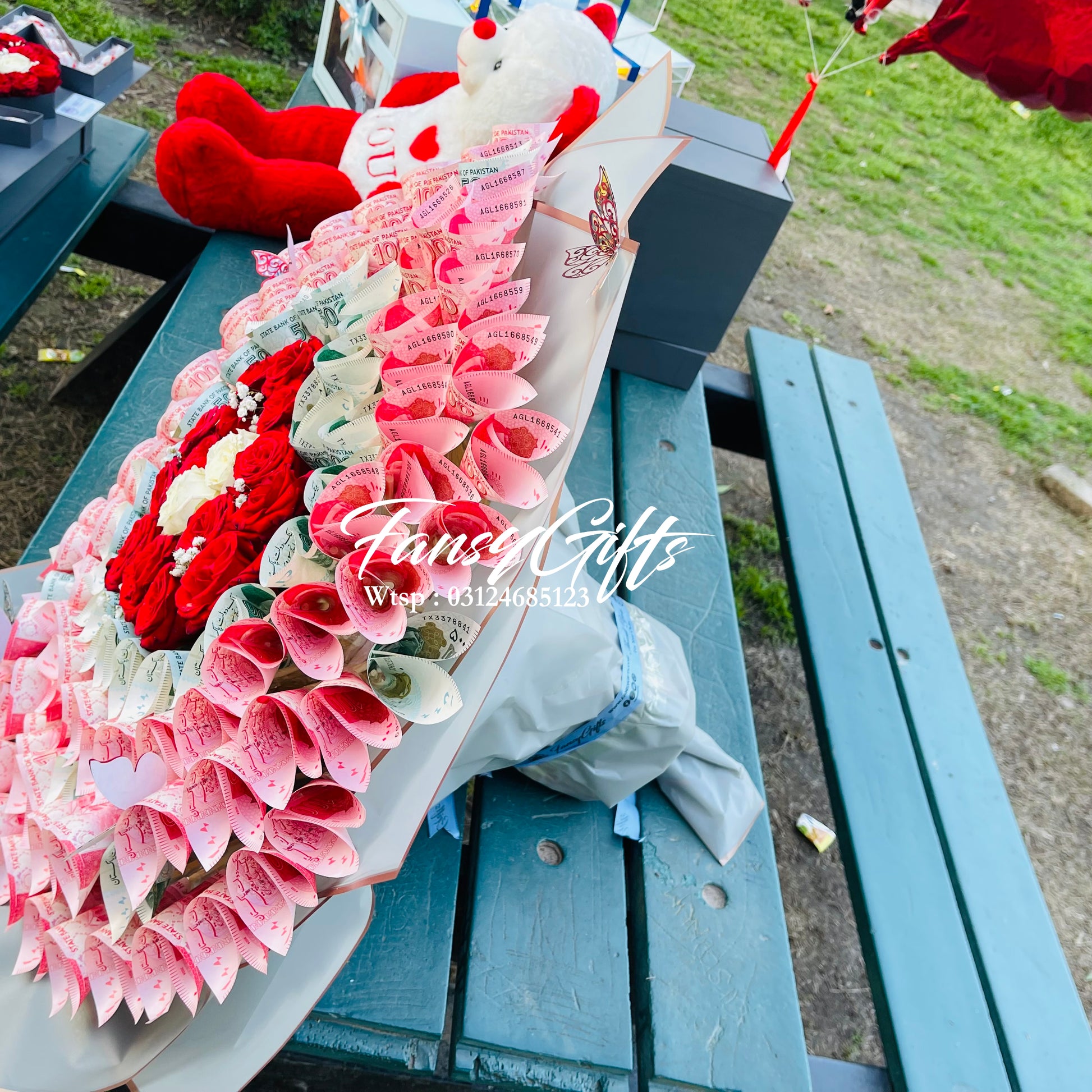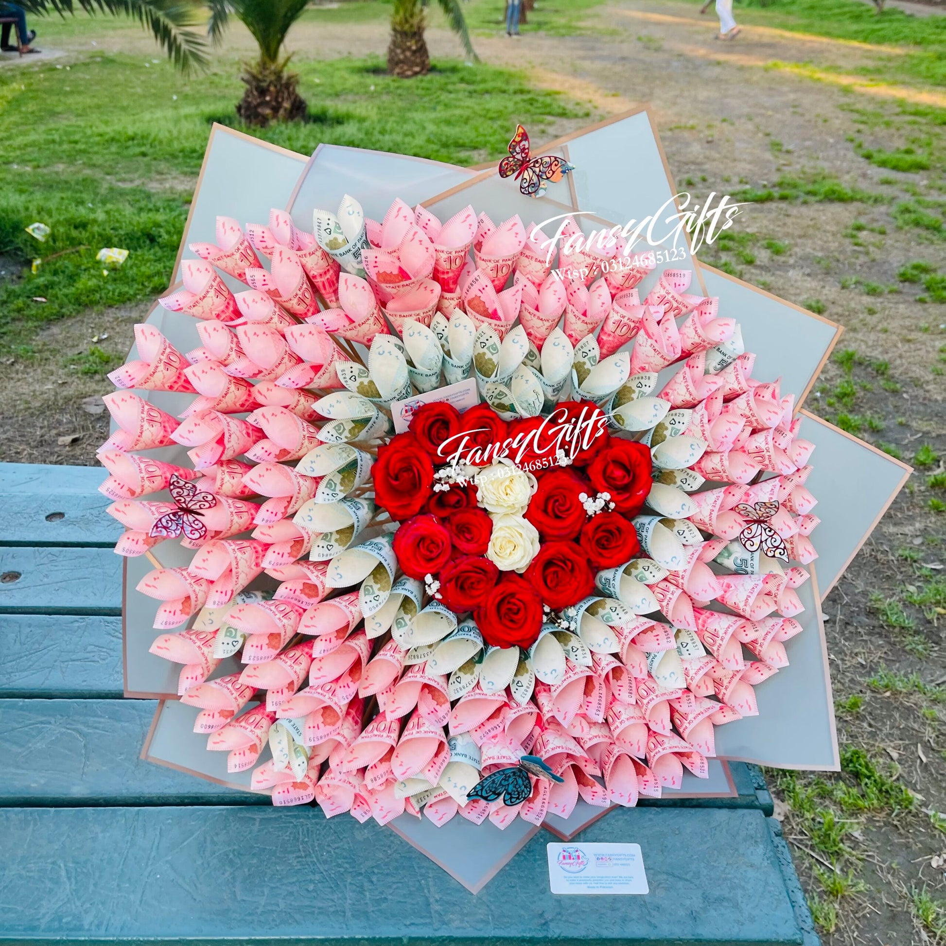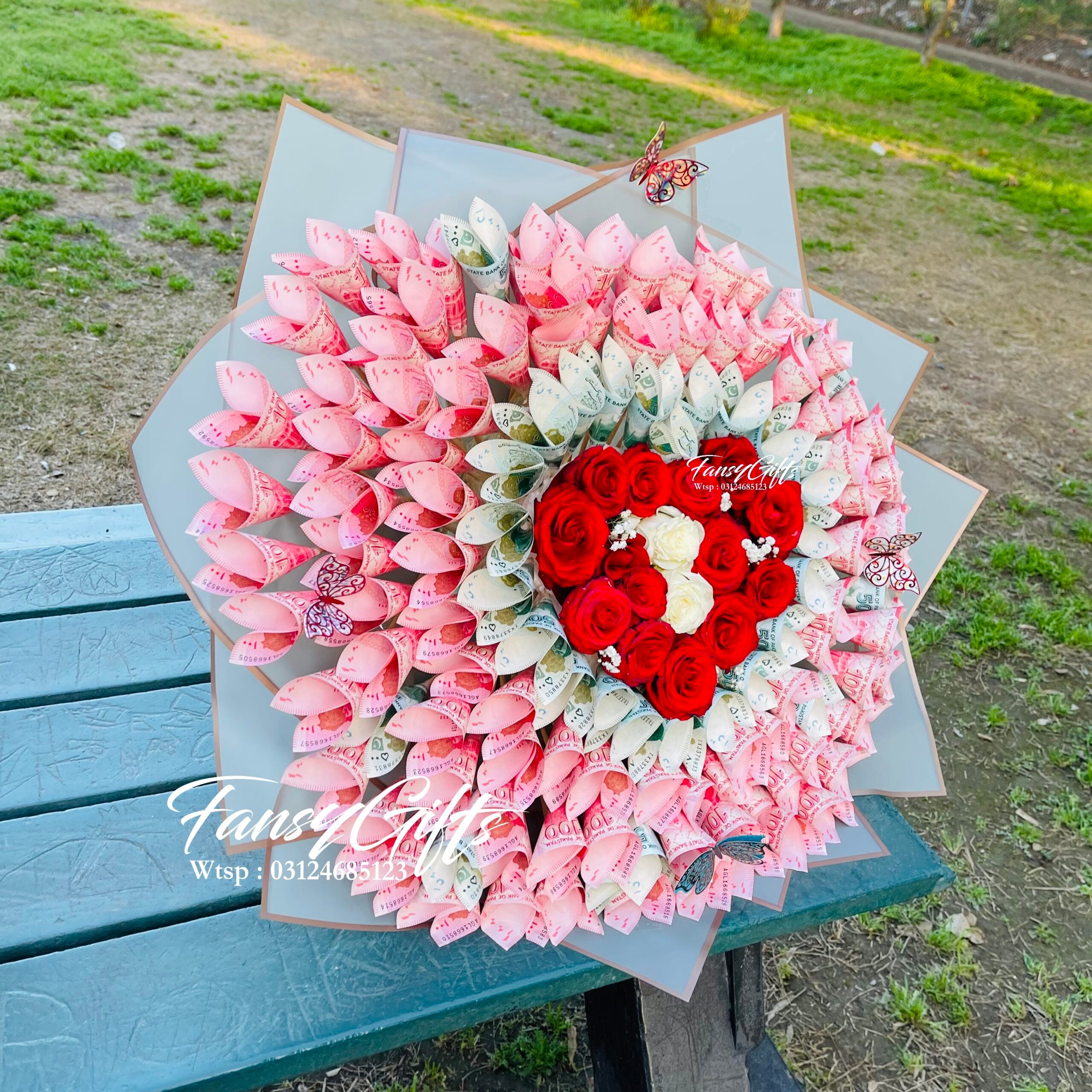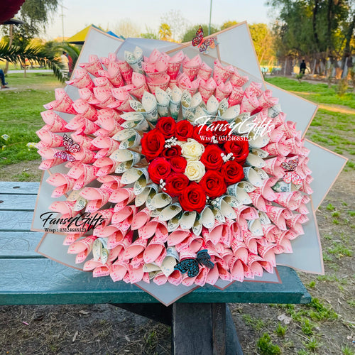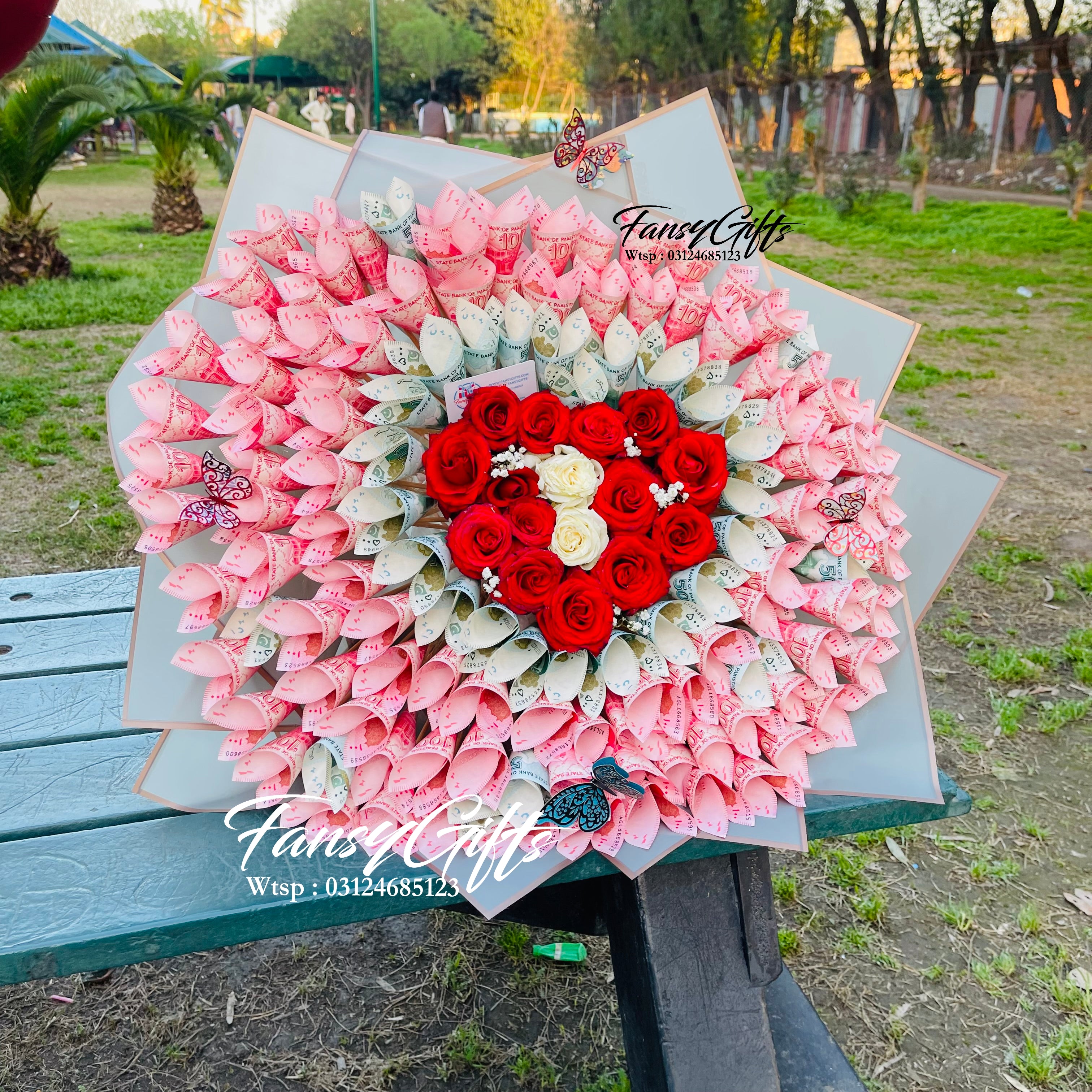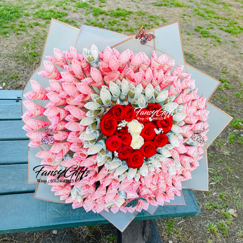 A stunning and luxurious customizable money bouquet featuring PKR 20,000 in notes, beautifully arranged with flowers and a heart centerpiece. The perfect unique gift for weddings, engagements, birthdays, and special celebrations!