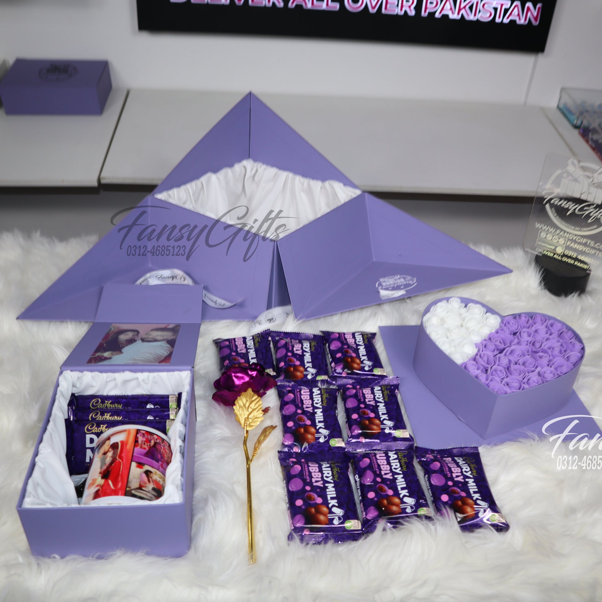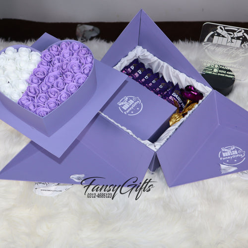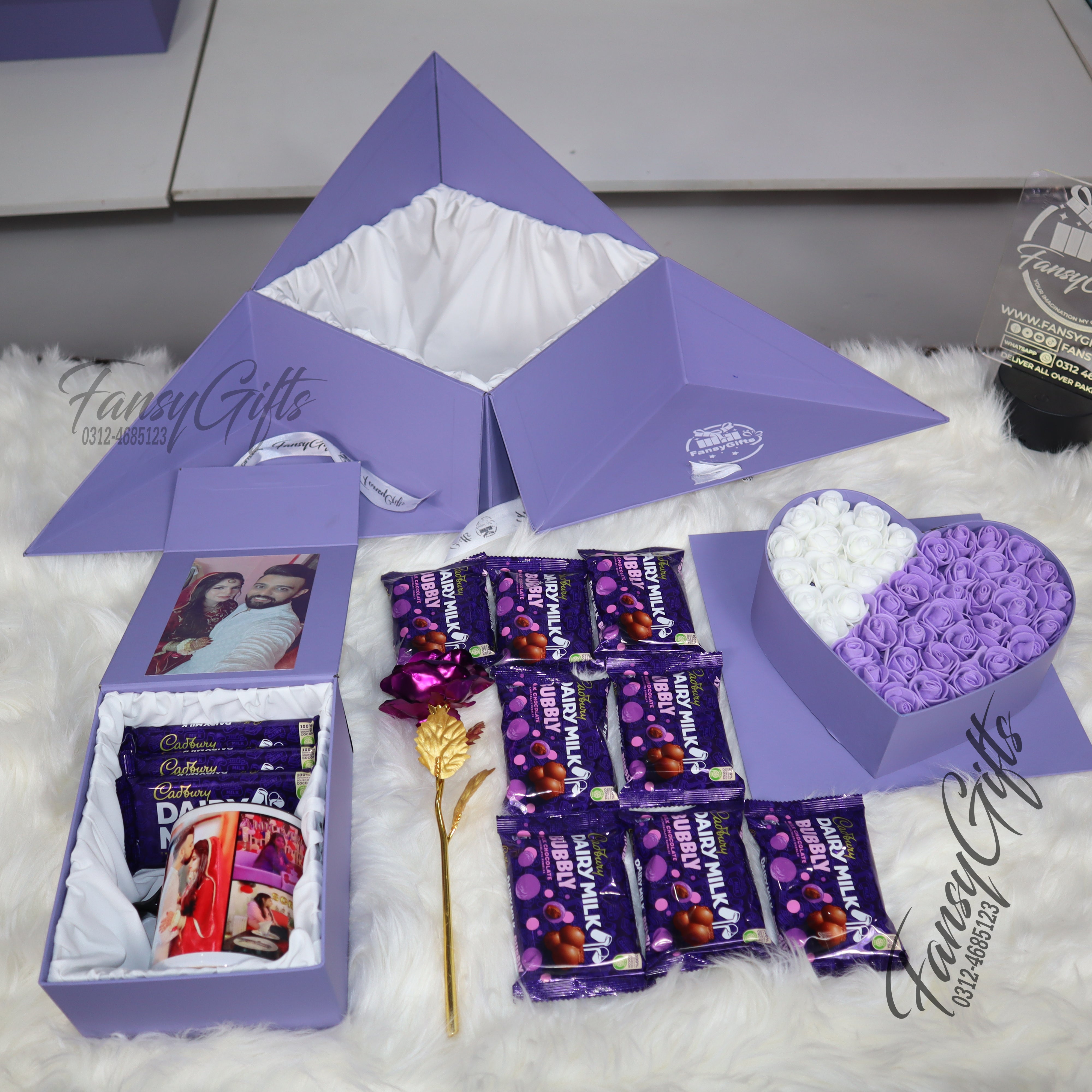 A stunning heart-shaped drawer corner box filled with delightful treats and personalized gifts. The perfect all-in-one gift package for your loved ones!