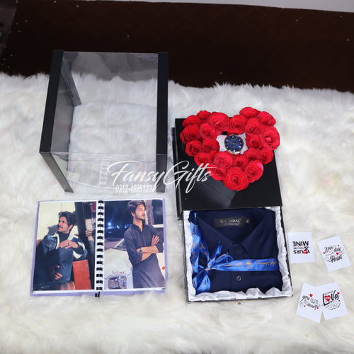 The most spectacular gift package ever! This stunning transparent heart drawer box is filled with multiple layers of surprises including flowers, chocolates, perfume, watch, shirt, photo album, and personalized cards.