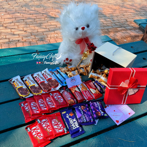 Make a grand romantic gesture with our Fluffy Big Size Teddy gift set - an impressive and luxurious combination featuring an extra-large cuddly teddy, elegant metal flower, and a surprise box overflowing with premium chocolates that will sweep your loved one off their feet.