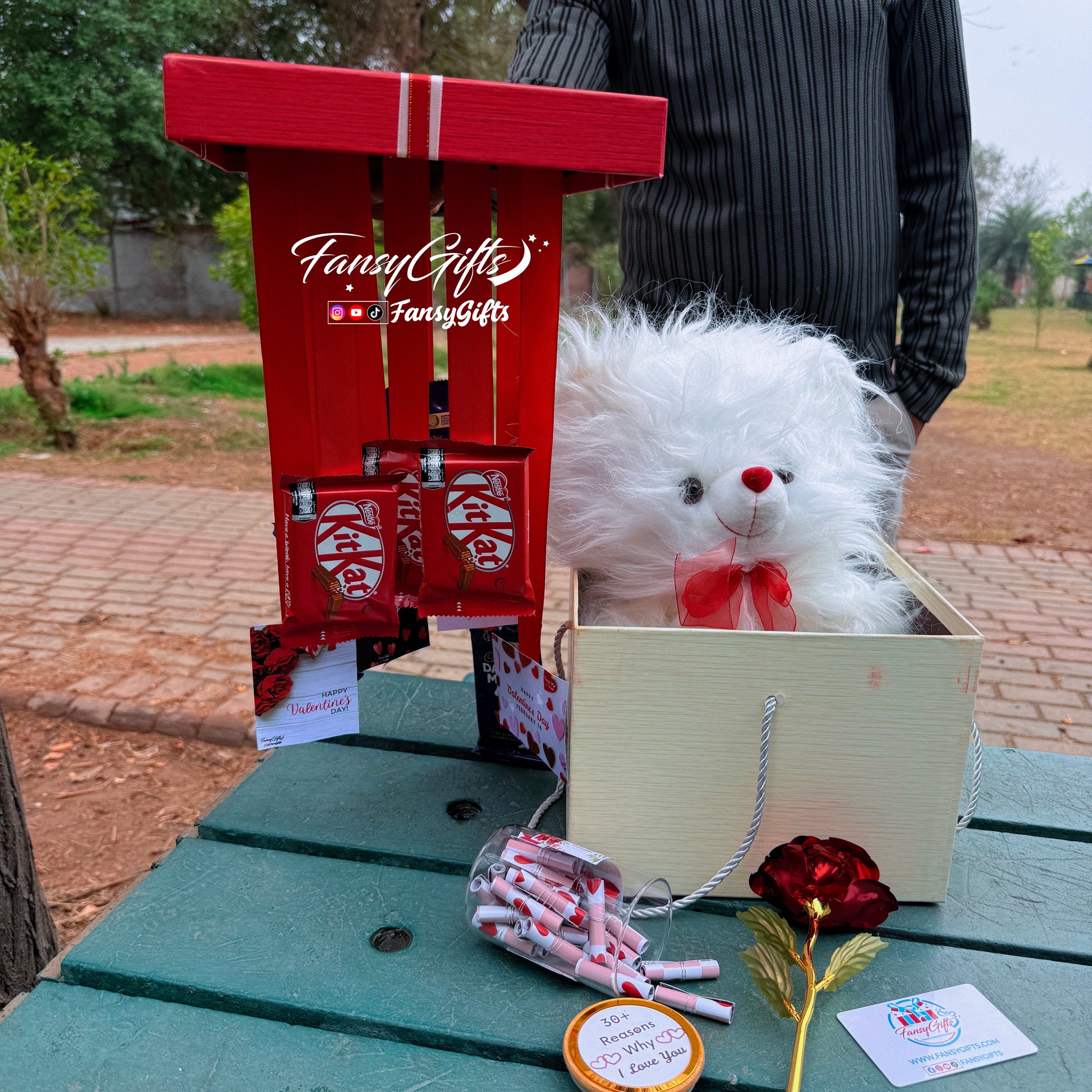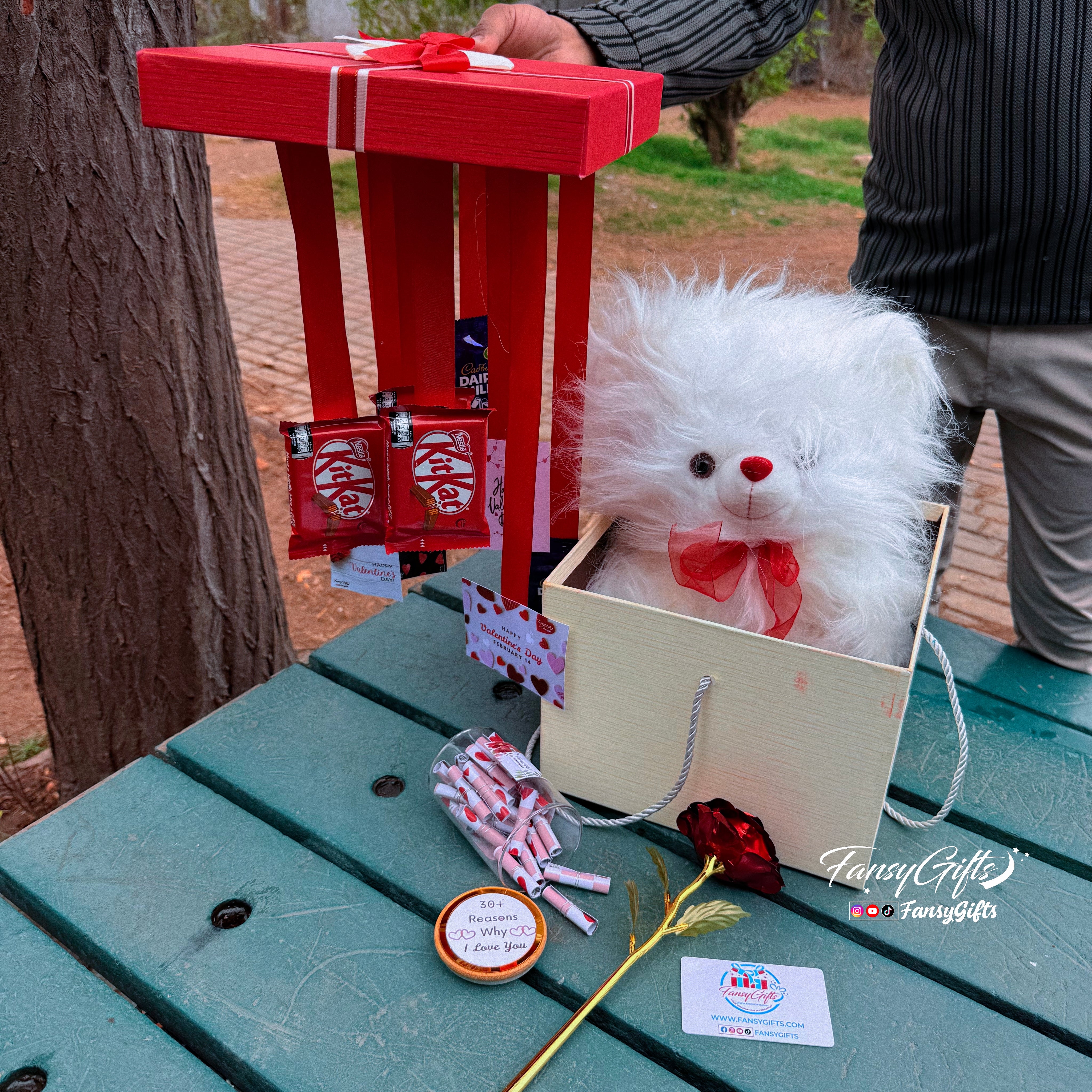 Big Surprise Box - Teddy, Hanging Chocolate, Metal Flower, Card & Love Jar