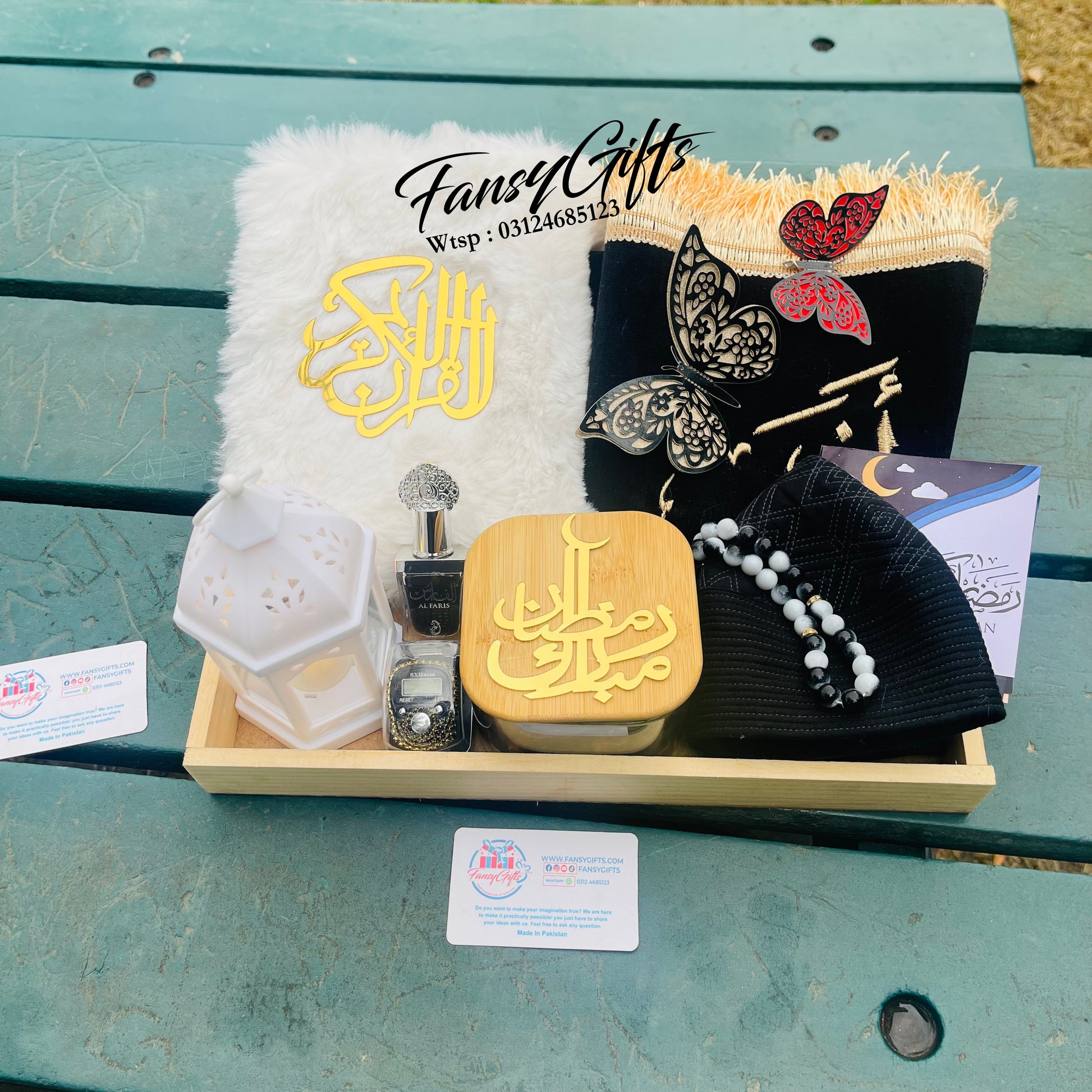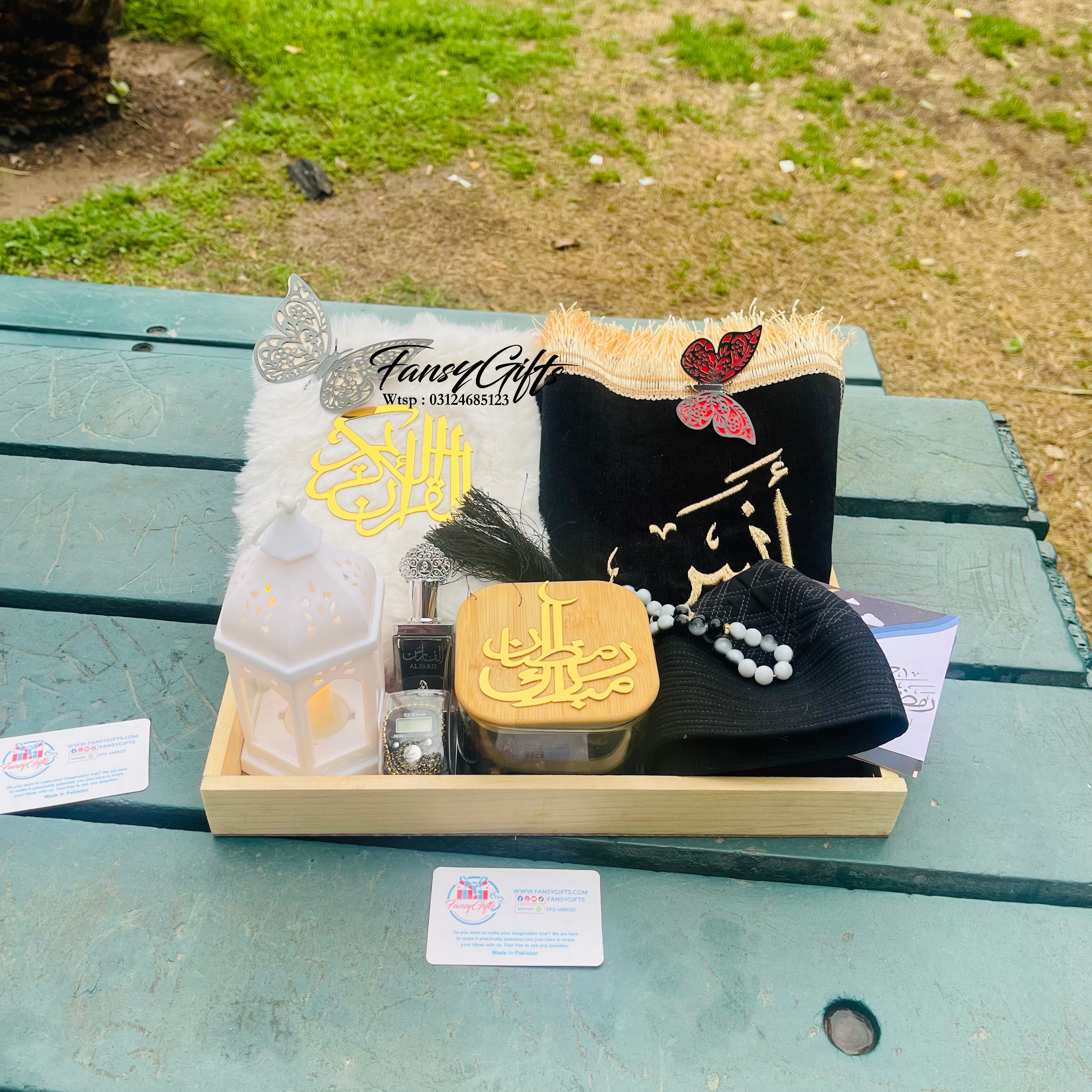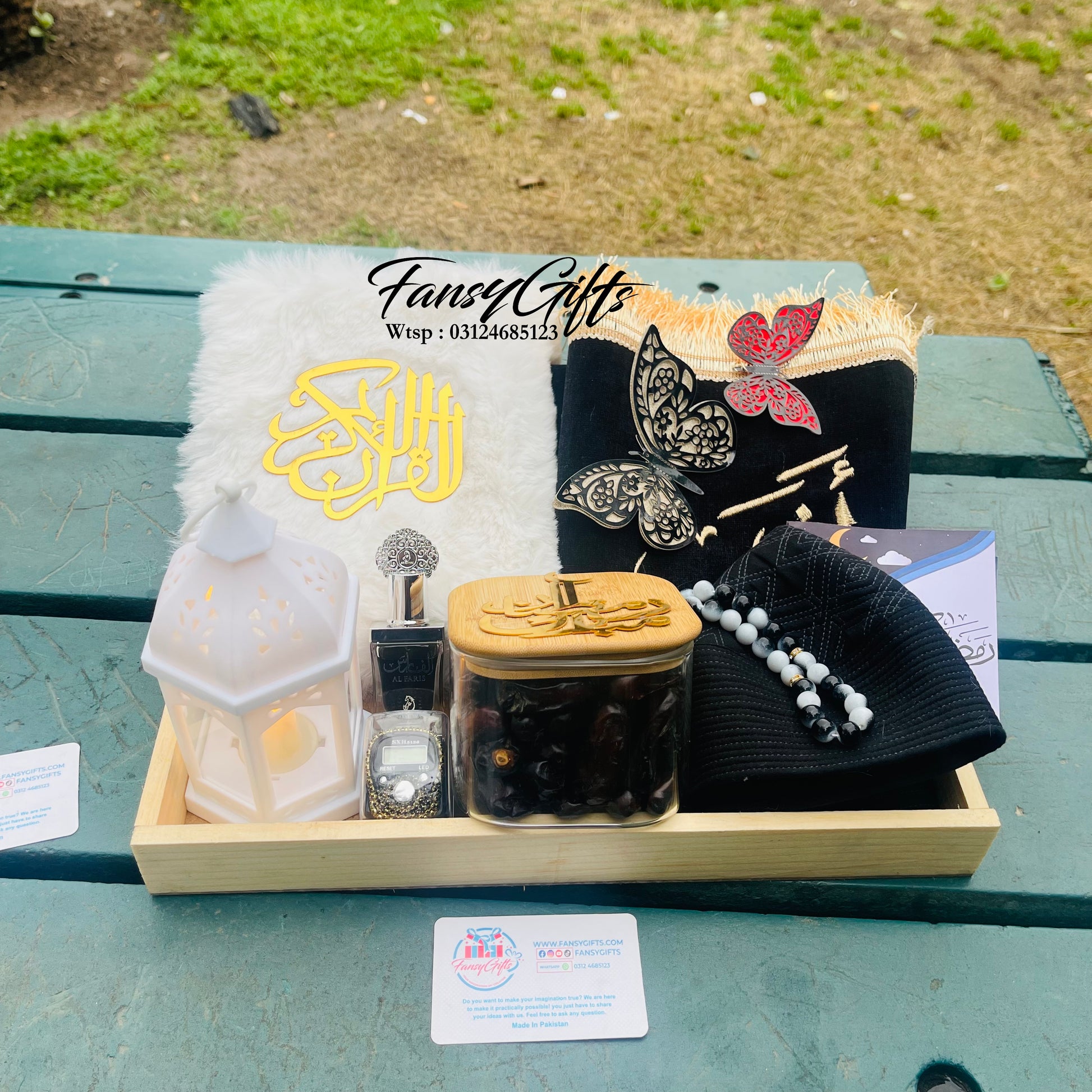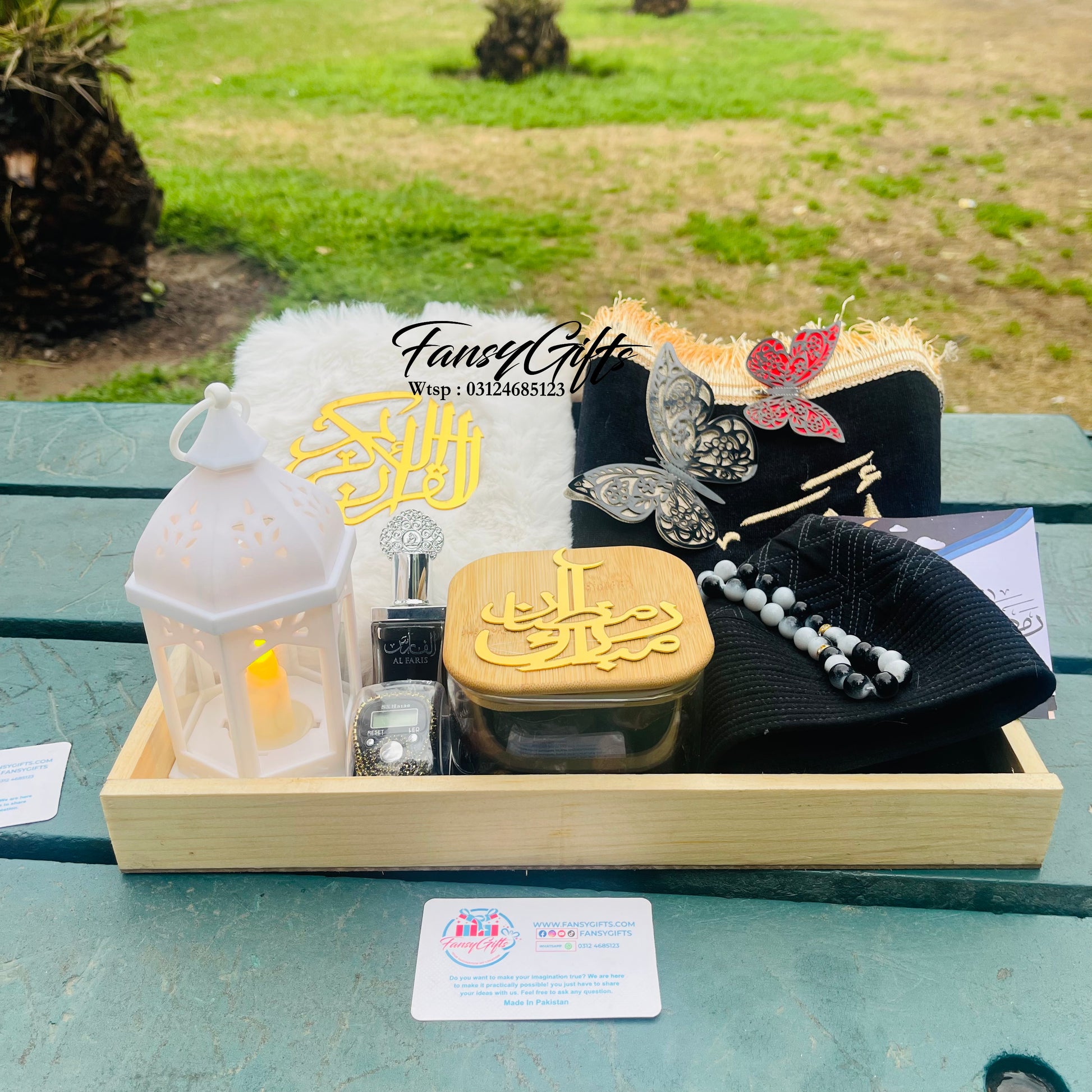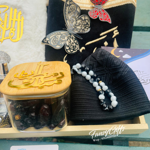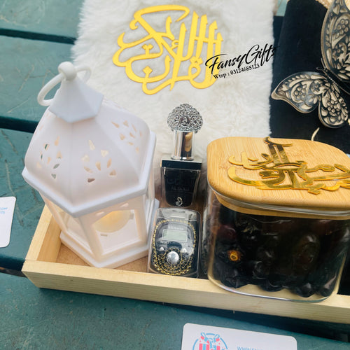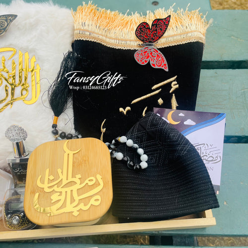 A beautiful premium Islamic gift basket with customizable options, perfect for Ramadan, Eid, and special Islamic occasions. This elegant basket is thoughtfully filled with spiritual essentials and personalized touches.