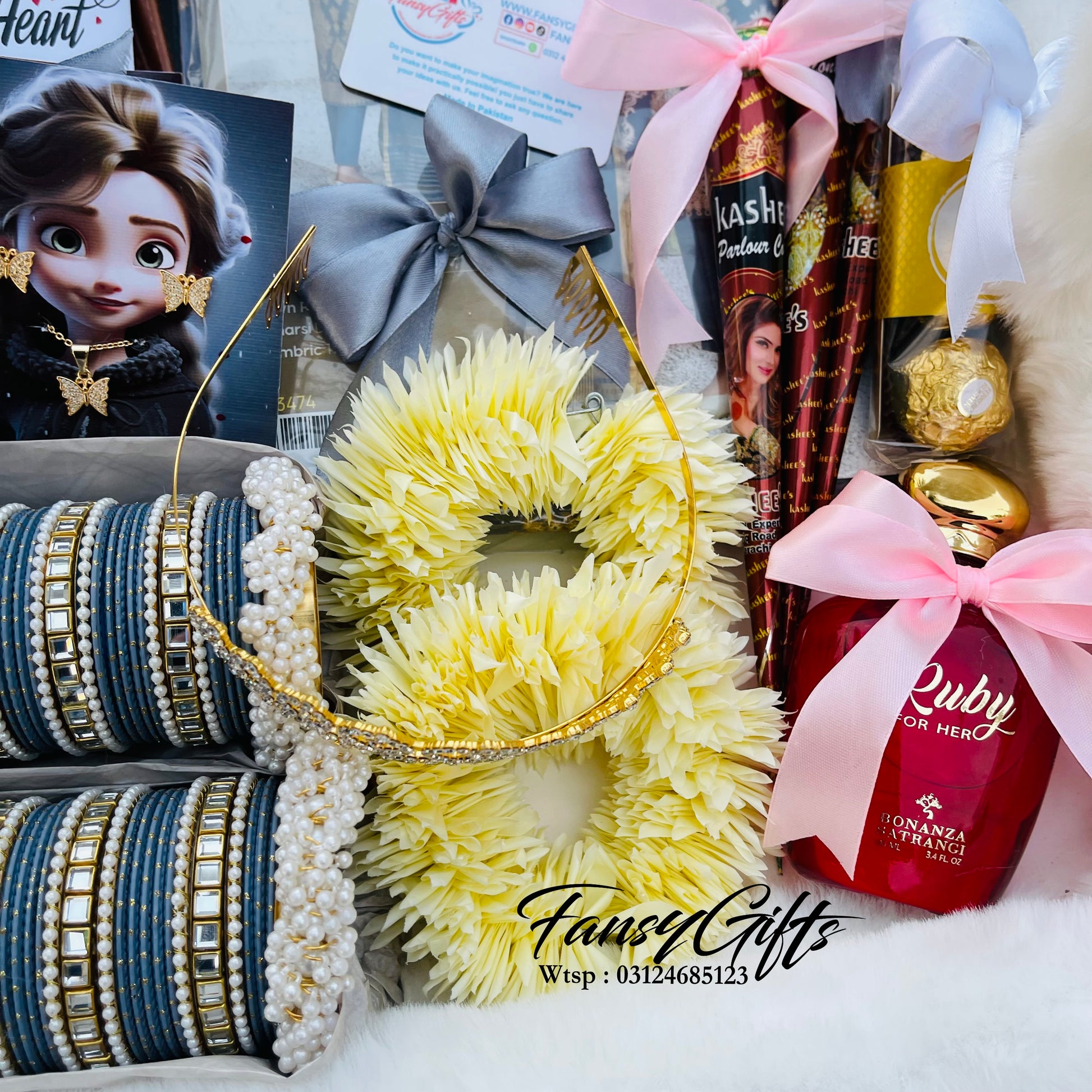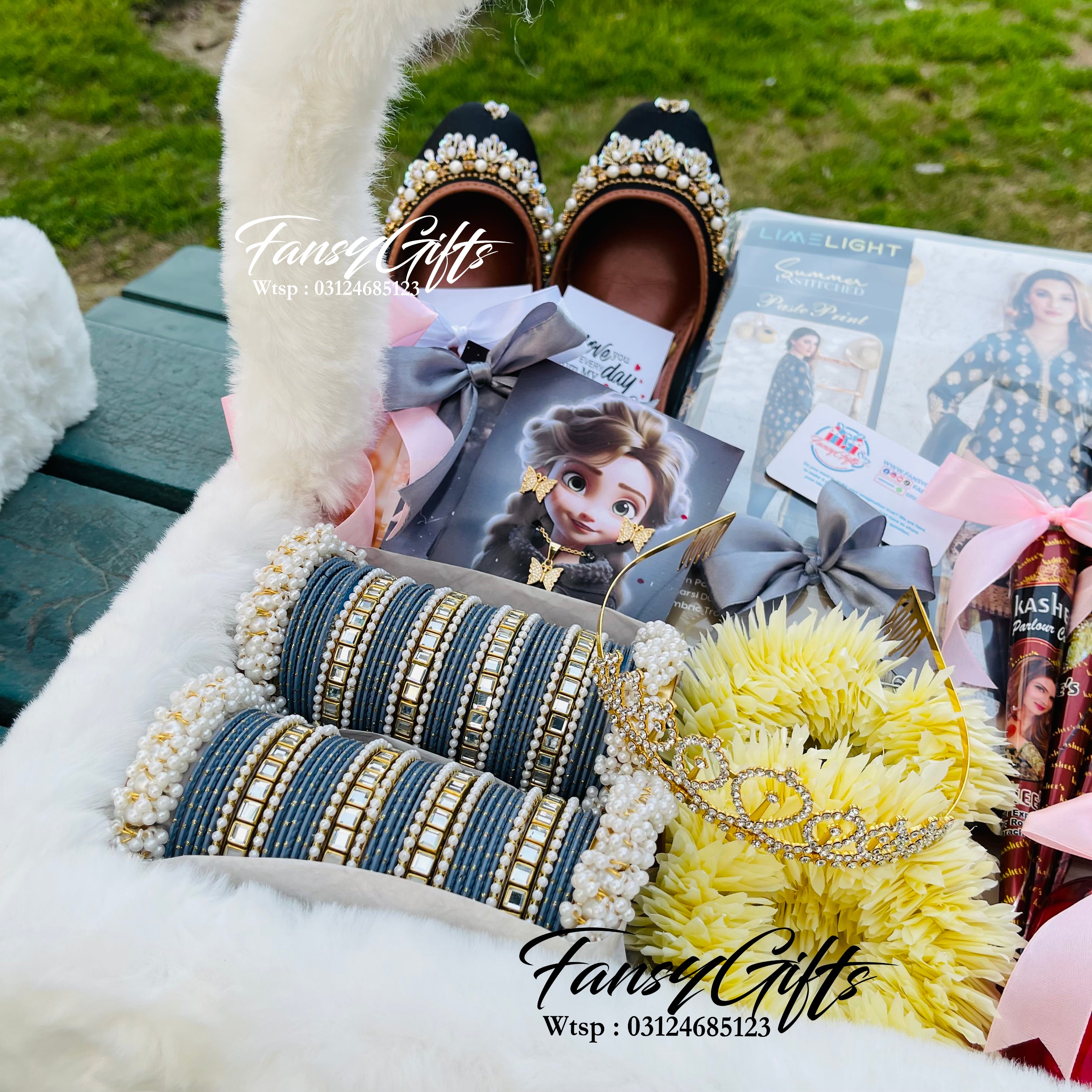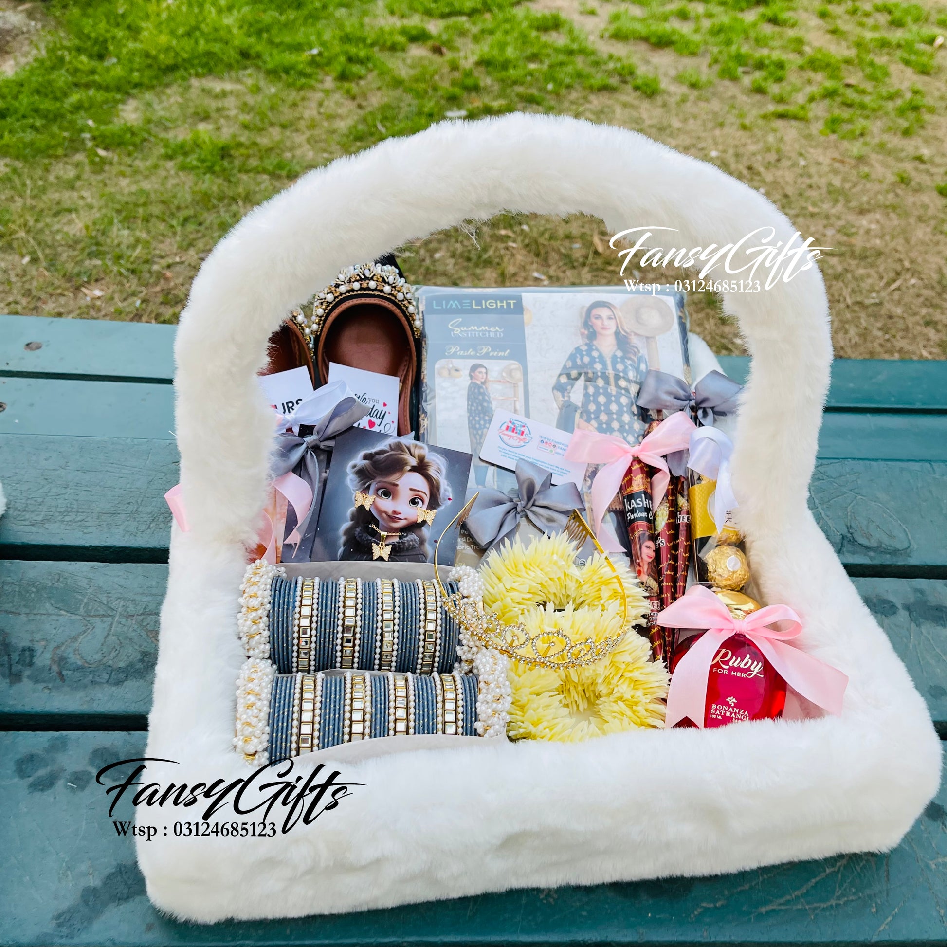 This fluffy basket gift hamper is ideal for bridal showers, mehndi functions, birthdays, or any occasion where you want to show someone how much they mean to you. The soft basket adds a cozy, luxurious touch that makes this gift truly memorable.